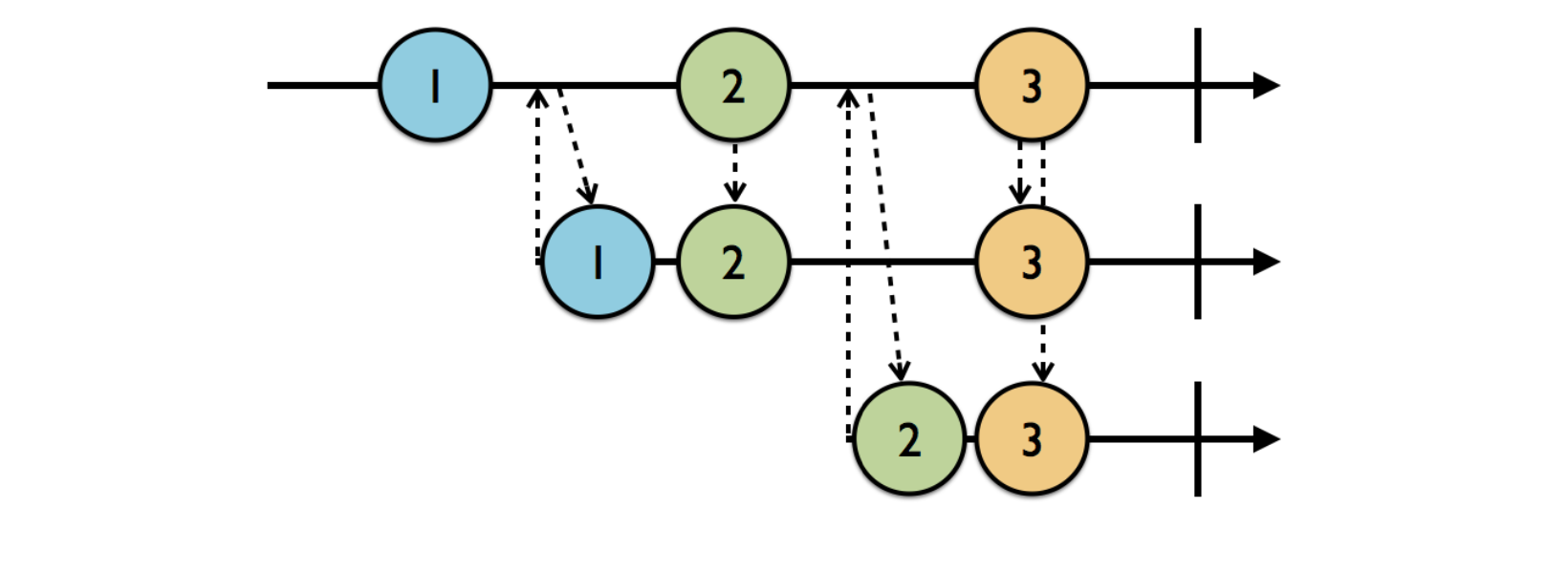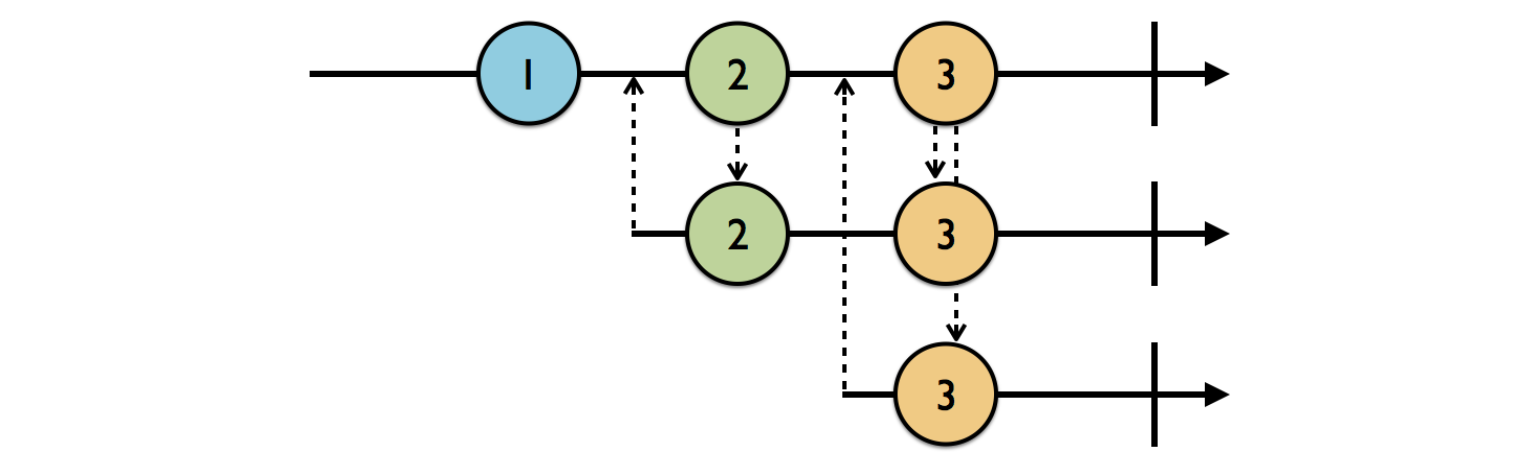 위 다이어그램에서 맨 윗 줄은 PublishSubject, 그리고 나머지는 구독자입니다.