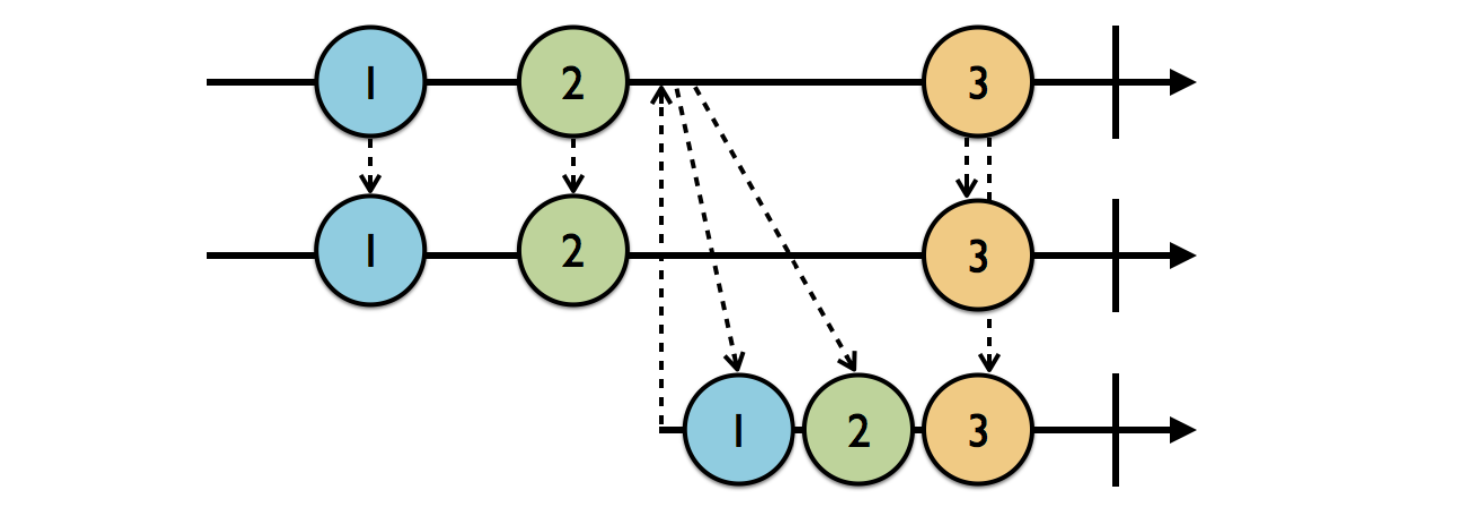 첫 번째 구독자 (두 번째 줄)는 이미 ReplaySubject를 구독하고 있는 상태이며, 그 후 발생한 event1, event2를 모두 즉시 전달받습니다. 그리고 두번째 구독자 (세번째 줄)는 구독한 시점에서 버퍼의 사이즈 만큼 저장된 event1, event2를 구독 즉시 전달받게 됩니다. 그 후 발생한 event3은 첫번째, 두번째 구독자 모두에게 즉시 전달되고 버퍼에 저장된 이벤트는 event2, event3으로 변경됩니다.