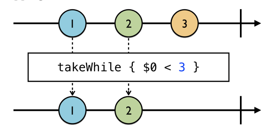 takeWhile은 해당 조건에 참인 동안 동작하고, 해당 조건에 거짓인 .next 이벤트가 전달된 직 후 .completed 이벤트가 발생하고 이후로 전달되는 .next 이벤트들은 수신하지 않습니다.
