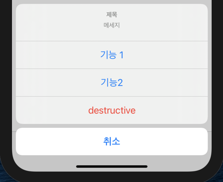 스타일은 일반 기능(default), 삭제 기능 등 (destructive) , 취소 기능 (cancel)이 있습니다.